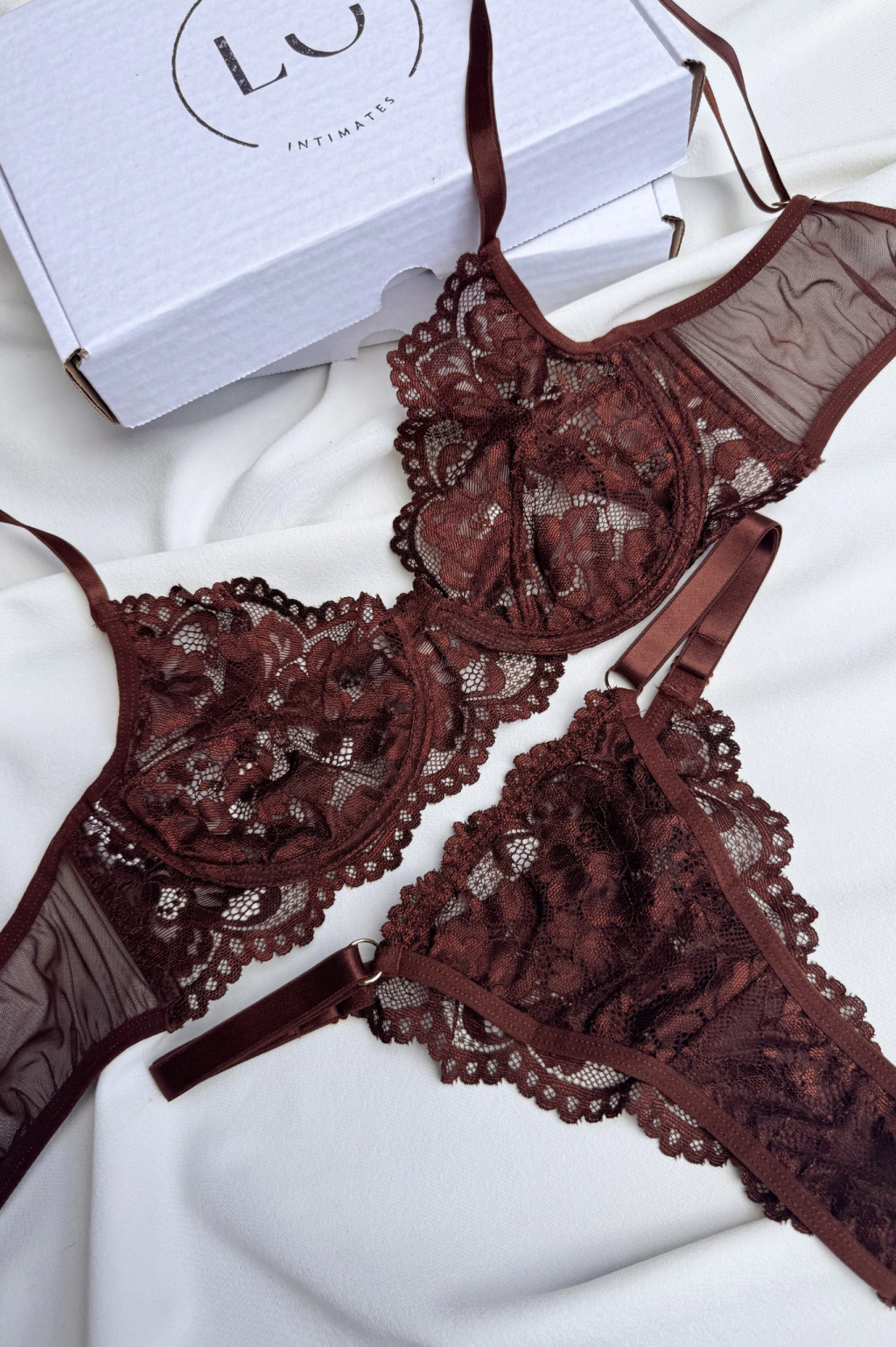 Sensualidade e sofisticação em um só conjunto! Feito em renda delicada na cor marrom, esse modelo exala charme e elegância. Os detalhes laterais em tule adicionam um toque de transparência sutil, realçando a feminilidade. A calcinha fio conta com regulagem, garantindo o ajuste perfeito ao corpo. Ideal para quem busca conforto sem abrir mão da sensualidade.